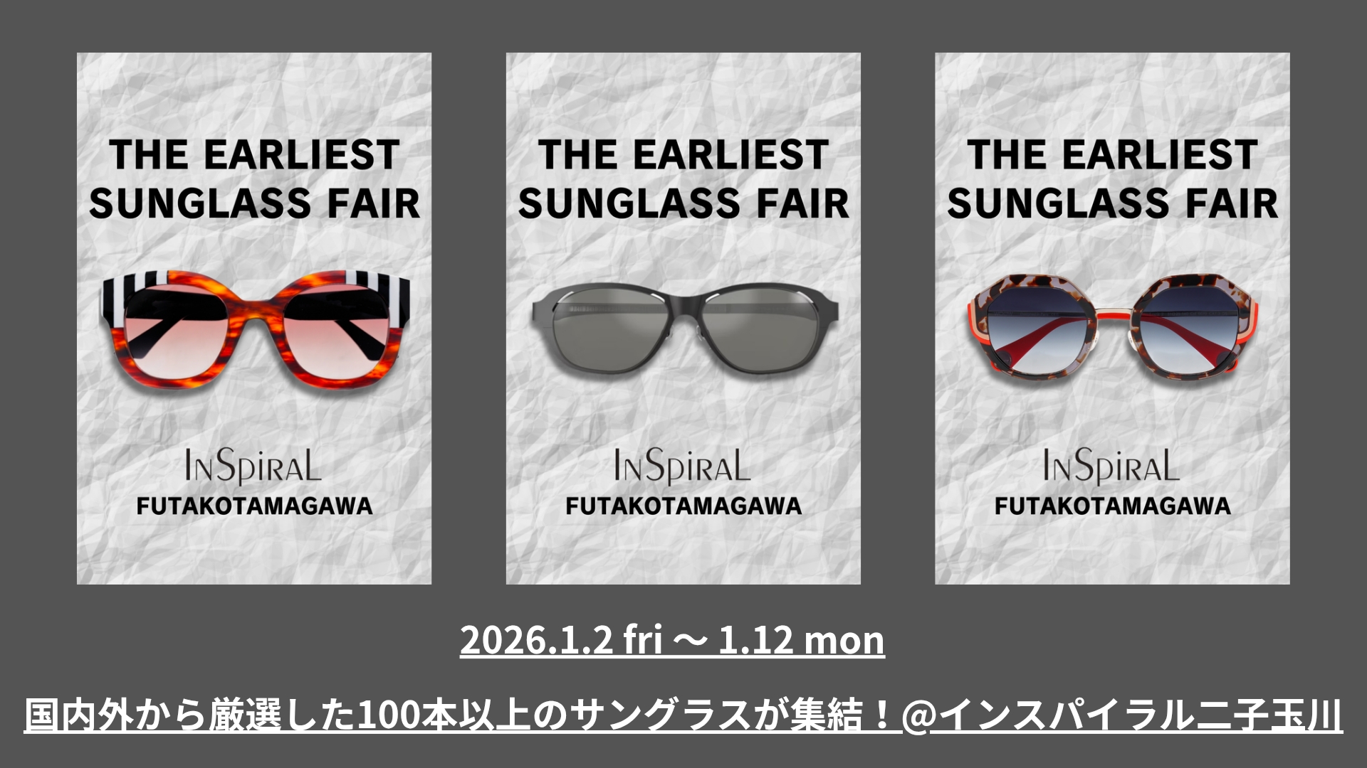 【二子玉川店イベント情報】1/2(金)~12(月)にかけて「日本一早いサングラスフェア」開催! 【湘南T-SITE店イベント情報】1/2(金)~6(火)にかけて、掛け心地の“最高峰” LINDBERG(リンドバーグ)TRUNK SHOW開催! 【オーダー開始】LINDBERG(リンドバーグ)の名作「Adani」が待望の復刻! 999.9(フォーナインズ)よりNEW COLLECTION 2025-2026 が各店に続々と入荷しております! News 2025/12/31 【二子玉川店イベント情報】1/2(金)~12(月)にかけて「日本一早いサングラスフェア」開催! 2025/12/31 【湘南T-SITE店イベント情報】1/2(金)~6(火)にかけて、掛け心地の“最高峰” LINDBERG(リンドバーグ)TRUNK SHOW開催! 2025/12/26 【インスパイラル各店の年末年始の営業について】 2025/12/09 【オーダー開始】LINDBERG(リンドバーグ)の名作「Adani」が復刻!(水谷豊さん演じる「相棒」の杉下右京役にてご使用モデルも含む) Blogメガネ、サングラスの情報を毎⽇お届け 2026/01/04 【新作入荷】999.9(フォーナインズ)NEW COLLECTION 2025-2026「M-400」 2026/01/03 【全店で予約開始】映画『罪と悪』にて主演の高良健吾さん着用の眼鏡 Micedraw Tokyo「MF3011-S9」が再入荷します! 2026/01/02 【全店で予約開始】インスパイラル全店で所ジョージさんご愛用の URM(ウルム)「U10-Black」の予約を開始します! Instagram 成城眼鏡店 二子玉川店 湘南T-SITE店 函館 蔦屋書店 フィール旭川店 高校生まで対象の安心価格 ご購入から3ヶ月の見え方保証